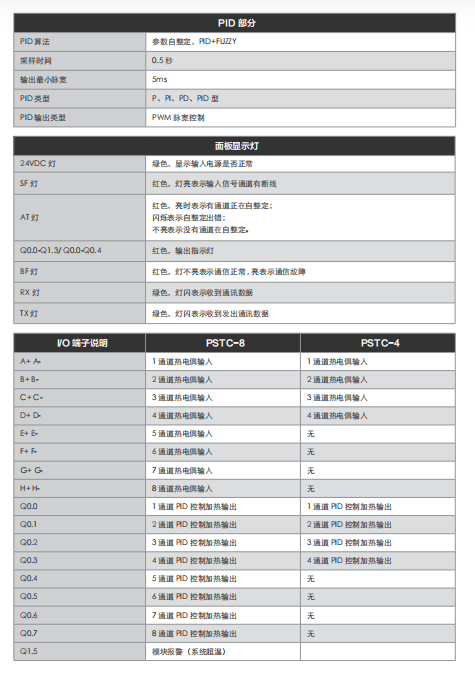 1. 电源、输入、输出及通讯口之间相互隔离,通过 4.4KV 群脉冲(EFT) 抗干扰测试,模块稳定、可靠; 2. 热电偶信号经过滤波、线性化、断线检测和冷端补偿,温度测量准确; 3. 24 位 Sigma-Delta A/D,分辨率 0.1℃,精确度 ±1℃; 4. 内置智能 PID 算法和最优控制,PID 参数自整定及优化功能,简单易 用、控温精确; 5. 每一通道可分别选择不同的测量类型,即同一模块可同时测量 8 种 不同类型热电偶; 6. 各路加热功率回路间具有 PWM 相位偏移功能,降低电力负荷冲击; 7. 支持 Modbus RTU 协议,高速带隔离的 RS-485 通讯 ( 高通讯速率 115.2kbps); 8. 提供 MODBUS-RTU OPC 服务器软件,用户可用其它软件(如: EXECL、WORD 等)轻松访问模块,读取相关数据用于专业分析, 不用为通讯协议的难题而苦恼; 9. 提供 PSTC-master 专用软件,轻松设定系统参数,分析温度曲线; 10. 系统最大可连 64 个 PSTC 模块,控制回路数由 4—512 回路任意组合; 11. 冷端控制功能和 PROFIBUS、DeviceNet、Ethernet/IP、Modbus/ TCP 通讯功能可选。
